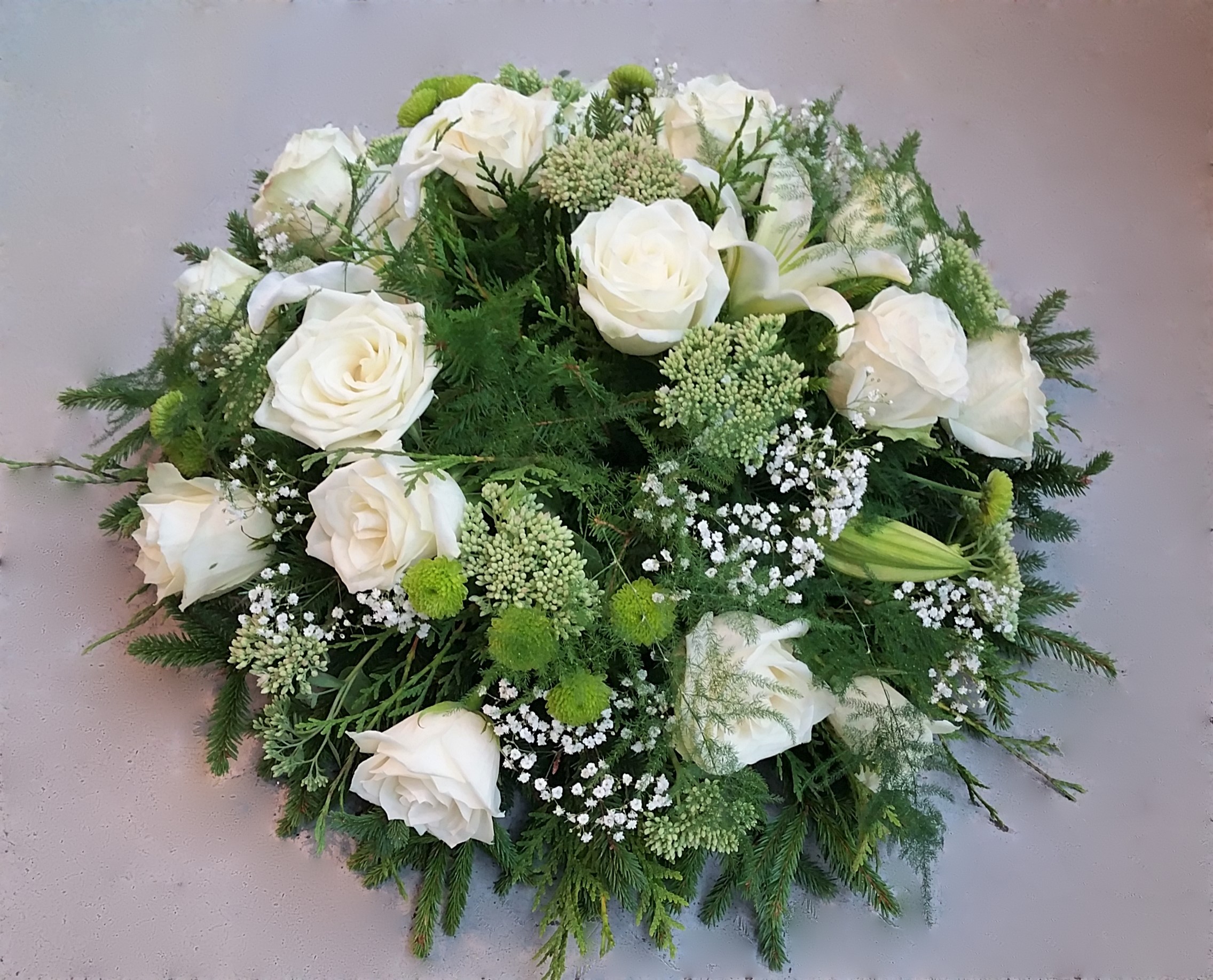 Eluslilledega leinakimp valge roheline. Lilledeks roos, liilia, krüsanteem, kipslill. Alus kuuse- ja männiokstest. ¤ 45-55 cm