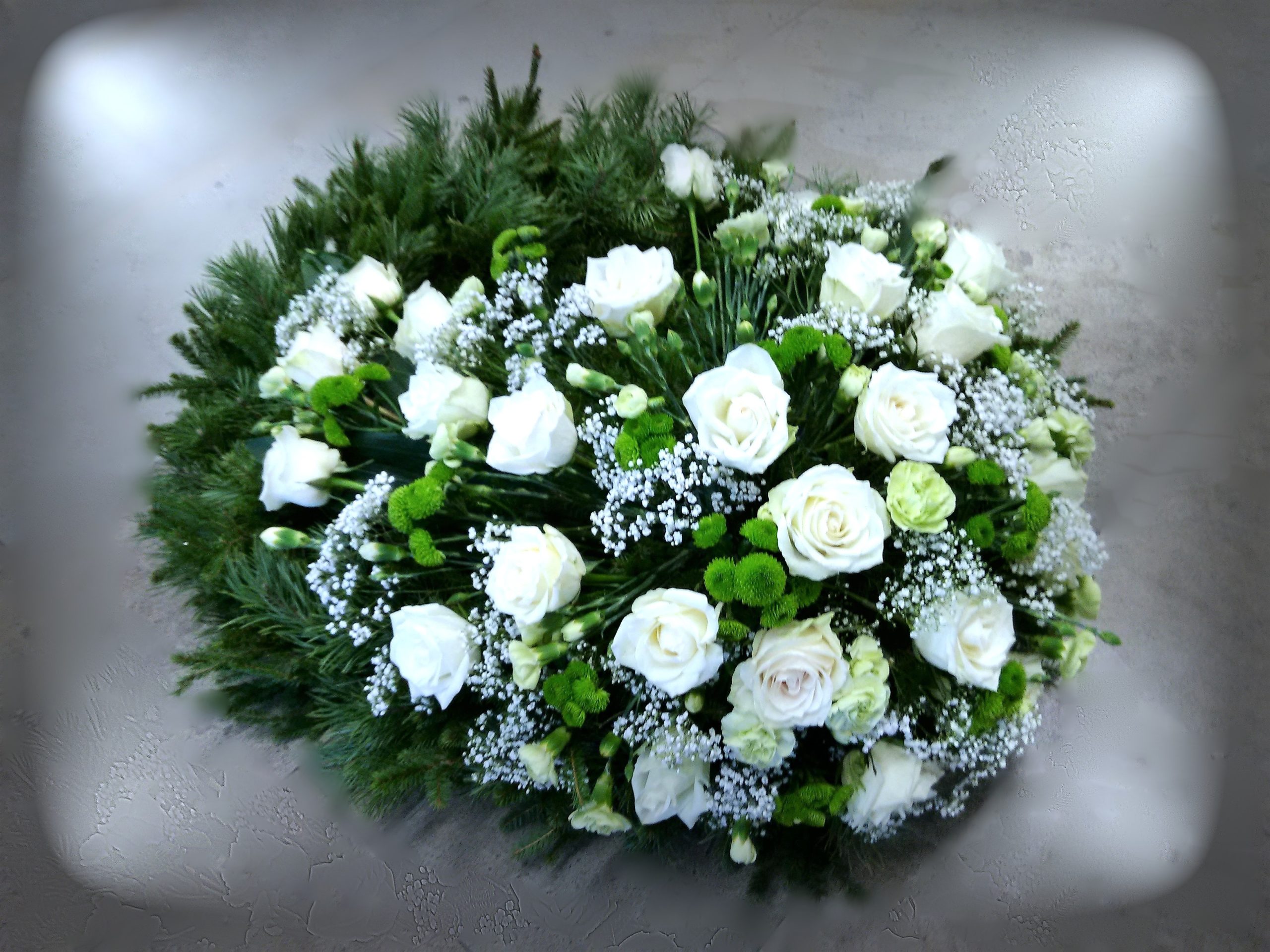 Eluslilledega leinapärg. Lilledeks roosid, krüsanteemid, kipslill. Pärg kuuse- ja männiokstest. ¤ 50- 60 cm